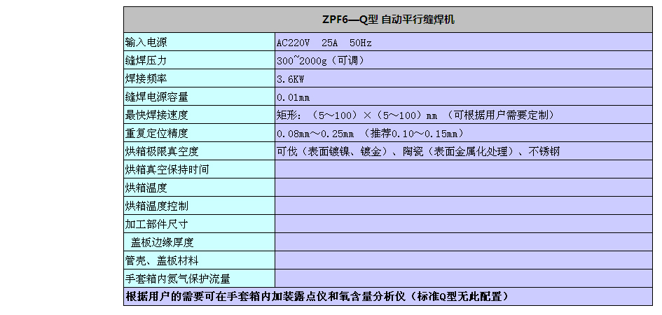 ZPF6—Q型平行縫焊機(系統(tǒng))首先對被焊接的零部件進行真空加熱(溫度可控)處理,確保被加工零部件表面的可揮發(fā)物、殘存的水汽全部處理干凈;第二,采用氣體(氮氣)保護技術(shù),使焊接加工環(huán)境可以完全與周邊環(huán)境隔離(采用氣體隔離手套箱);第三,采用高頻脈沖(可調(diào))電流焊接,其焊接點距、散熱系數(shù)可調(diào),確保殼體溫度不超過允許值;第四,焊接過程中,蓋板與殼體之間始終承受一定(可調(diào))的壓力,以適應(yīng)各種材料和不同尺寸的底殼及蓋板縫焊的狀況,保證焊接的密封指標(biāo)達到要求。