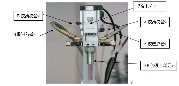 機(jī)頭的右側(cè)是B膠的進(jìn)膠管,與B膠的計(jì)量泵相連接。